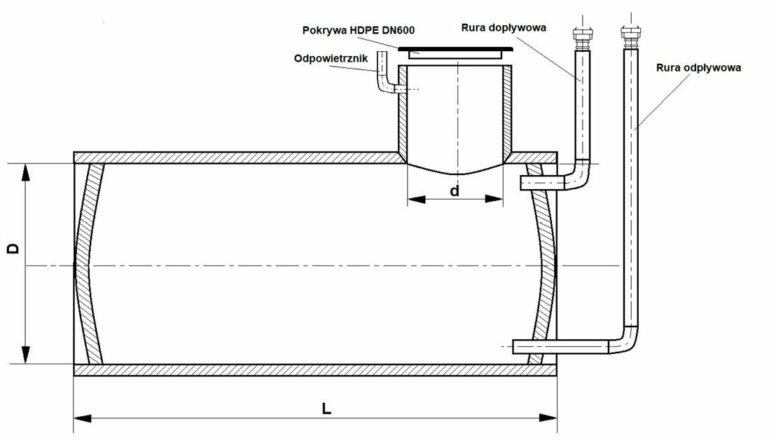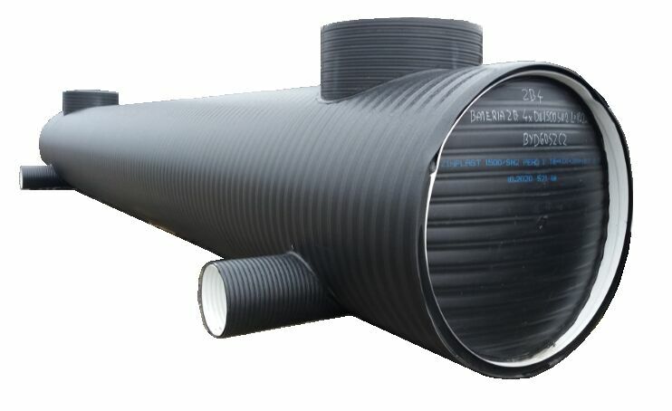 wyposażony jest w dopływ oraz odpływ (zakończone złączem STORZ), jak również we właz wejściowo-inspekcyjny. Zbiornik można wyposażyć w sensory poziomu płynów, znajdujących się wewnątrz zbiornika. Zbiornik może mieć objętości kilkunastu do nawet kilkudziesięciu m3, przy czym zbiornik może być połączony z innymi zbiornikami, tworząc baterię zbiorników. Cena w ofercie dotyczy zbiornika o pojemności 8 m3, SN2, DN1400.